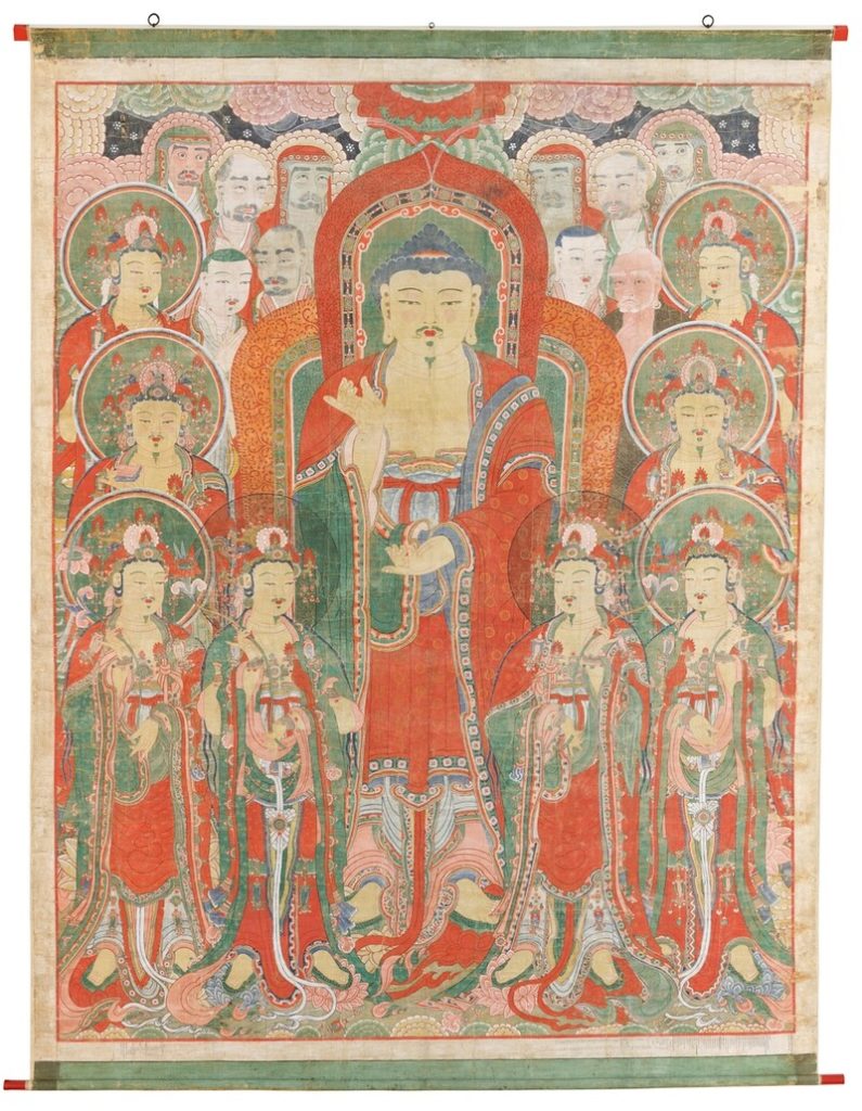 Traditionally hung in temple courtyards during major ceremonies such as Buddha’s Birthday, the painting was made by connecting 16 silk panels. It is regarded as the last known work of Domun, one of seven monk-painters credited with its creation, and stands as a representative piece of his artistic style.